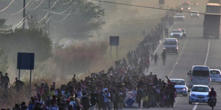 A caravan in Mexico of at least 1,000 migrants resumed its march northward towards the US border on Monday, accusing Mexican authorities of failing to fulfill their promise of granting humanitarian visas.Carrying a banner that read “Exodus from poverty” and chanting “We are not criminals.