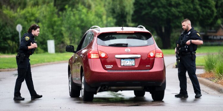 Police officers check a vehicle entering a neighborhood in Brooklyn Park, Minnesota after the shooting of two state lawmakers and their spouses / ©AFP