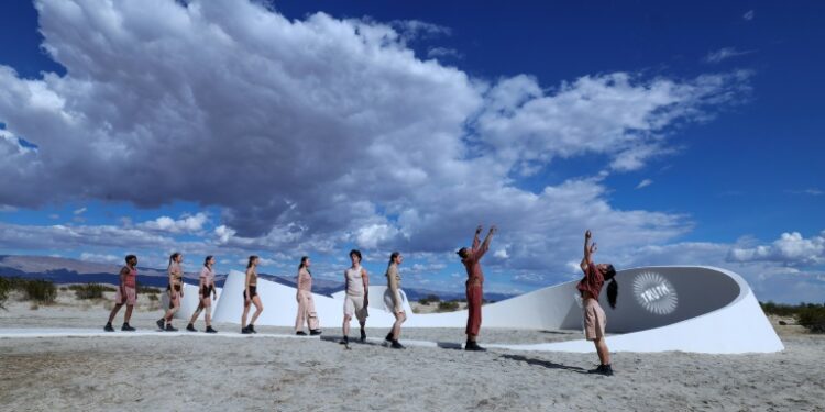 French-American artist Sarah Meyohas used intricately curved metallic mirrors to reflect and refract the bright desert sunlight, beaming the words “Truth Arrives in Slanted Beams” across the sides of a meandering 400-foot (120-meter) stucco ribbon. “Truth is definitely something that’s at stake in today’s world,” she explained. “And I try to make art that is not tricking anybody. This isn’t a trick. This is the light. And this is true.” Using “caustic” technology based on the way light “plays at the bottom of a swimming pool” to turn sun beams into text, the work speaks to “a world in which we are so politically divided,” she told AFP.