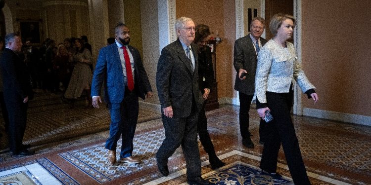 US Senate Minority Leader Senator Mitch McConnell, Republican of Kentucky, walks to his office from the Senate floor after announcing he is stepping down as the Republican leader at the US Capitol / ©AFP