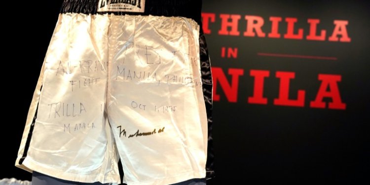 New York (AFP) – The shorts worn by Muhammad Ali in his legendary “Thrilla in Manila” boxing match are up for grabs at Sotheby’s in New York, part of a growing sports memorabilia market eyed by auction houses.