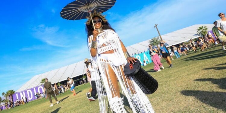 Over the years Coachella fashion has become something of a cliche, a boho amalgam of mid-aughts trends like flower crowns, crochet, wide-brim hats, bold jewelry and cowboy core including suede vests and frayed denim. Much of that remains standard fare at the festival, but Coachella 2025 saw a handful of other trends take center stage. One popular look was giving Italian grandmother: silk scarves knotted at the chin were all the rage. And many attendees wielded paper parasols to shield themselves from the midday sun. But a baffling number of people sported leather looks — pants, boots, corsets, even jumpsuits — despite scorching temperatures exacerbated by a lack of shade and lengthy walks between stages. But then again, being seen has never been about comfort. Other festival-goers had an easier time beating the heat by wearing as little as possible: bras under sheer lace overlays, push-up bustiers or simply nipple covers. And in case you missed it, street fashion is still decidedly Y2K: halter tops, tube tops, pleated miniskirts and hip bone baring low-rise bottoms remain youthful favorites.