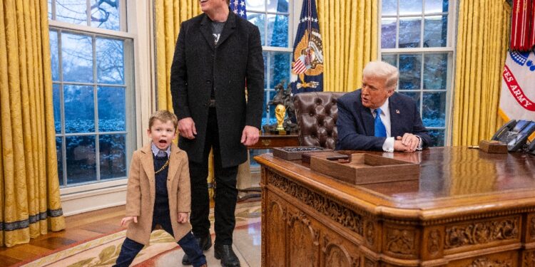 Washington (AFP) – Elon Musk made his debut public appearance with Donald Trump at the White House Tuesday to announce fresh powers to overhaul the US government — even if the tech tycoon’s son tried to steal the show. Dressed in a black “Make America Great Again” cap, black t-shirt, and overcoat, the SpaceX and Tesla tycoon spoke to reporters in the Oval Office while the US president sat behind the historic Resolute Desk. Tasked by Trump to lead federal cost-cutting efforts through his “DOGE” agency — the so-called Department of Government Efficiency — Musk warned that the United States would go “bankrupt” without cuts.