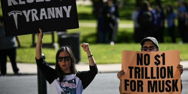 Anti-Musk protesters plan a demonstration outside the Tesla gigafactory that day, after an anti-Musk rally in downtown Austin on Wednesday. “A trillion dollars is way too much any person should have under any circumstances,” activist Ethan McBride told AFP, calling the package a means of “enriching the man who is funding degradation of our democracy.”