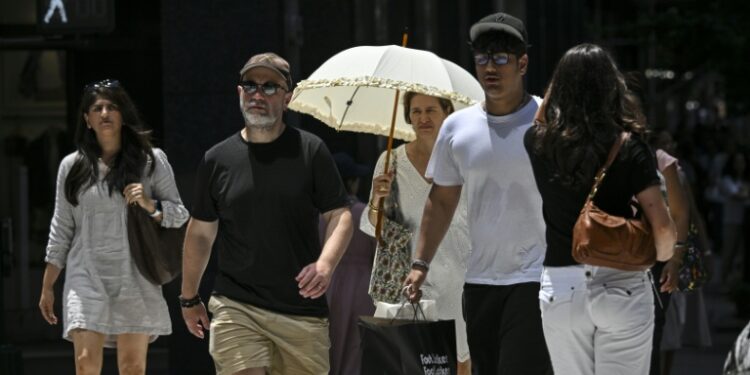 New York (AFP) – Tens of millions of Americans sweltered outside or sought air-conditioned refuge as an “extremely dangerous” heat wave blanketed the eastern United States on Tuesday with record high temperatures. As a fierce sun reflected off the skyscrapers of New York, the normally frenetic Times Square was virtually deserted by mid-day as the mercury reached 99 degrees Fahrenheit (37 Celsius), the hottest since 2012 in the Big Apple. By mid-afternoon, Newark, New Jersey hit 103F (39.4C), according to the National Weather Service, and Philadelphia also reached 100F (38C). New Yorkers walked under umbrellas as they navigated the streets of Manhattan, while others sunbathed in swimsuits in parks.