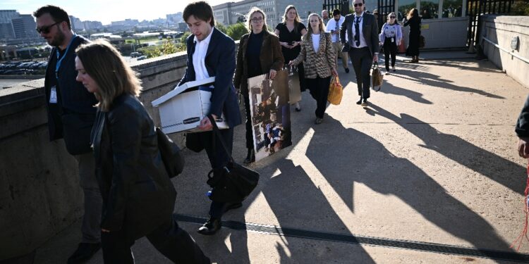 Reporters carry their belongings from the Pentagon on October 15, 2025 after news outlets including AFP, AP, The New York Times and Fox News declined to sign new restrictive Pentagon media rules, and were stripped of their press access credentials / ©AFP