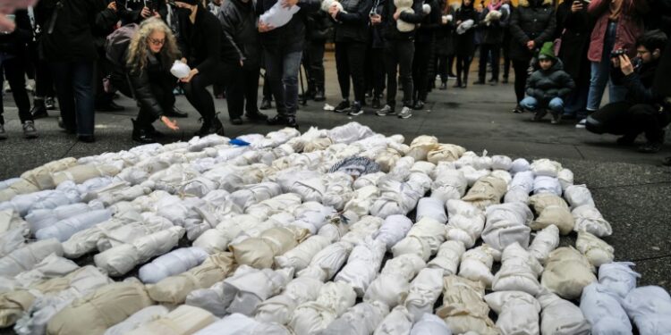 New York (AFP) – Hundreds of pro-Palestinian protesters took to the streets of New York on Thursday, staging a mock funeral in a demonstration against Israel’s continued heavy bombardement of the besieged Gaza strip.