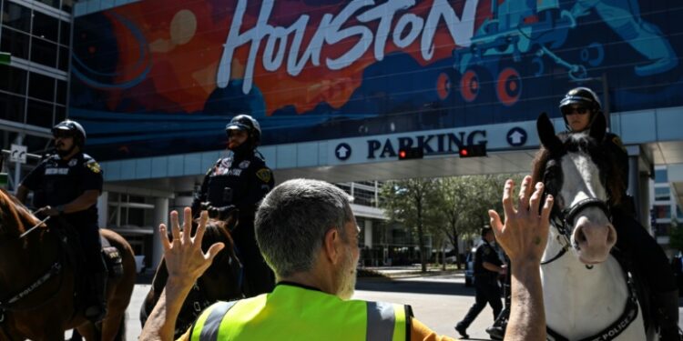 Demonstrators protest against the Ceraweek by S&P Global energy conference, near the hotel where the conference is being attended, in Houston, Texas, on March 10, 2025. ©AFP