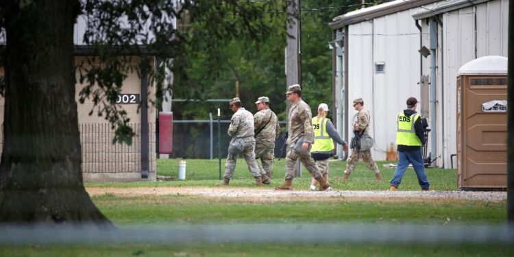 Texas Army National Guard troops are seen at a military facility in Elwood, Illinois on October 7, 2025 / ©AFP