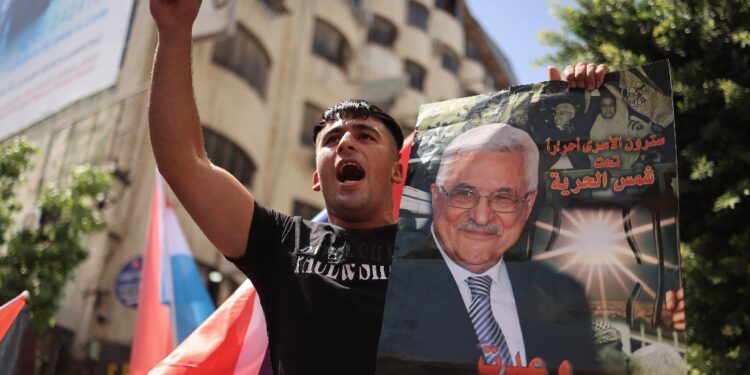 A Palestinian chants slogans in Ramallah while holding a portrait of Palestinian Authority president Mahmud Abbas / ©AFP