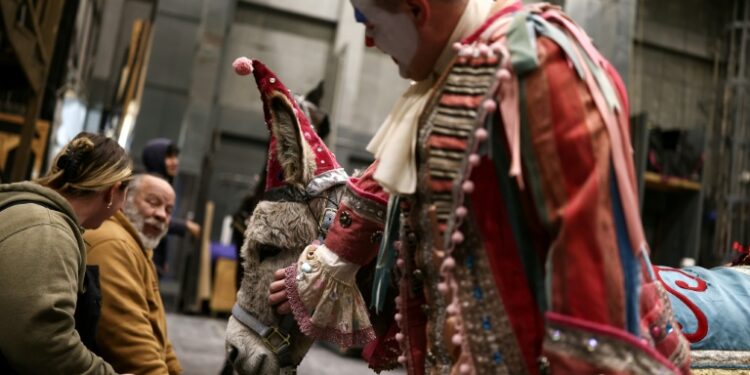 Their handlers don cloaks alongside the animals during the performance, while Wanda’s costume includes a magenta cone hat with multi-colored gems and a frilly collar. As they wait in a holding area for their cues, Max usually naps, handler Angelina Borello told AFP during one performance. Wanda gets visits and pets from people including actor Gregory Warren, who plays Parpignol. Wearing elaborate clown make-up, he pats his co-star lovingly. “I think it comforts them a little bit just to know who’s there and who’s dressed like a clown,” Warren said. “She’s very chill. It’s a lot of fun. It adds an energy, I think especially for the kids on the stage, to get to see a live animal in action in the middle of it all.”