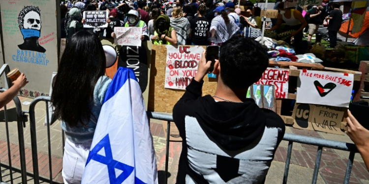 Pro-Israel (front) and pro-Palestinian students face off at an encampment on the campus of the University of California Los Angeles . ©AFP
