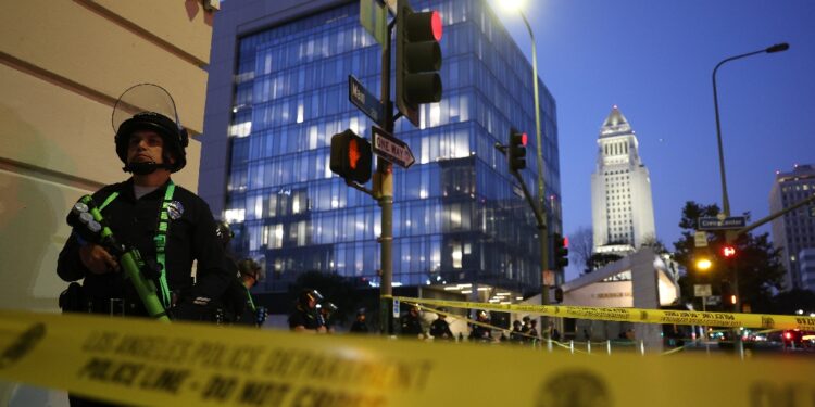 Los Angeles (United States) (AFP) – Downtown Los Angeles was largely calm overnight into Wednesday, with police arresting at least 25 people for violating a curfew after a fifth day of protests against President Donald Trump’s immigration crackdown. Heavily armed security officers, including several riding horses, patrolled near government buildings, while men boarded up storefronts after dark on Tuesday to protect against vandalism. Looting and vandalism in the second-biggest US city have marred the largely peaceful protests over ramped-up arrests by immigration authorities.
