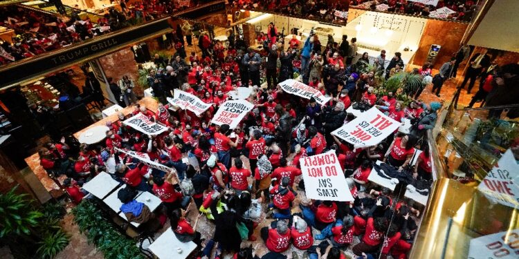 (AFP) – Hundreds of Jewish demonstrators overran New York’s Trump Tower on Thursday in support of Palestinians as well as detained Palestinian student campaigner Mahmoud Khalil. Wearing matching red T-shirts emblazoned with “Jews say stop arming Israel,” the group protested for over an hour inside the Manhattan skyscraper, where President Donald Trump’s family business is headquartered and he has a personal residence. The building was also where Trump memorably rode down a golden escalator in 2015 to announce his first run for president.