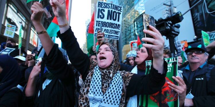 New York (AFP) – Cries of “Free Palestine” rang out in New York on Friday, as thousands of protesters took to the streets to denounce Israeli bombings in the Gaza Strip.