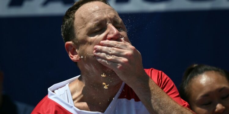 New York (AFP) – Competitive eater Joey Chestnut recaptured his title at the Nathan’s Famous hot dog eating contest on Friday in Brooklyn, downing 70.5 hot dogs and buns in 10 minutes in the July 4th holiday classic. The 41-year-old American missed last year’s event after signing a deal with Impossible Foods, whose plant-based products include hot dogs, but he was allowed to enter this year and made his Coney Island comeback a triumphant one.
