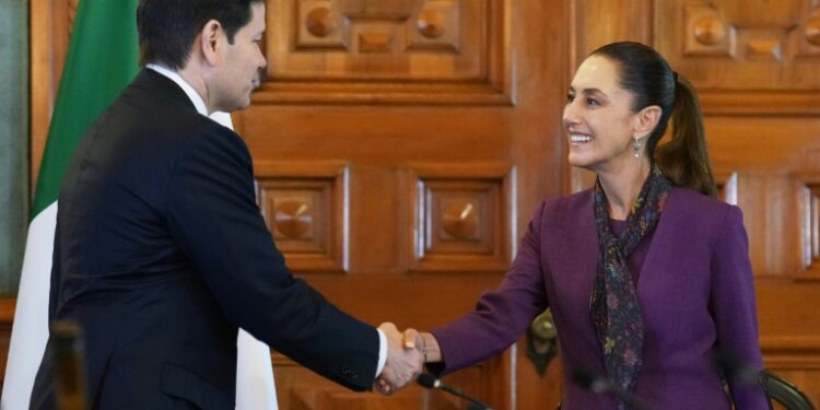 US Secretary of State Marco Rubio shakes hands with Mexico's President Claudia Sheinbaum at the Palacio Nacional in Mexico City on September 3, 2025. ©AFP