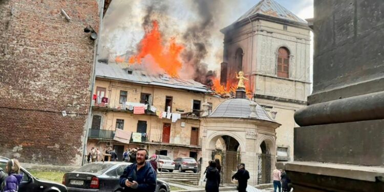 In Lviv, a western city far from the front, an AFP reporter saw a column of flames rising from a building next to the 17th-century St. Andrew’s Church and Bernardine Monastery in the city centre, which was struck during evening rush hour. Firefighters were working to put out the blaze at the apartment building, whose roof had been smashed in and windows blown out. First responders and locals were seen sheltering inside a church in mid-attack, waiting for the all-clear to go back outside.
