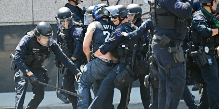 Los Angeles (United States) (AFP) – Demonstrators torched cars and scuffled with security forces in Los Angeles on Sunday as police kept protesters away from the National Guard troops President Donald Trump sent to the streets of America’s second-biggest city. Unrest broke out for a third day, with protesters angry at action by immigration officials that has resulted in dozens of arrests of what authorities say are illegal migrants and gang members. The raids — which began in broad daylight on Friday in a city with a large Latino population — were always likely to spark reaction among the public in the liberal city.