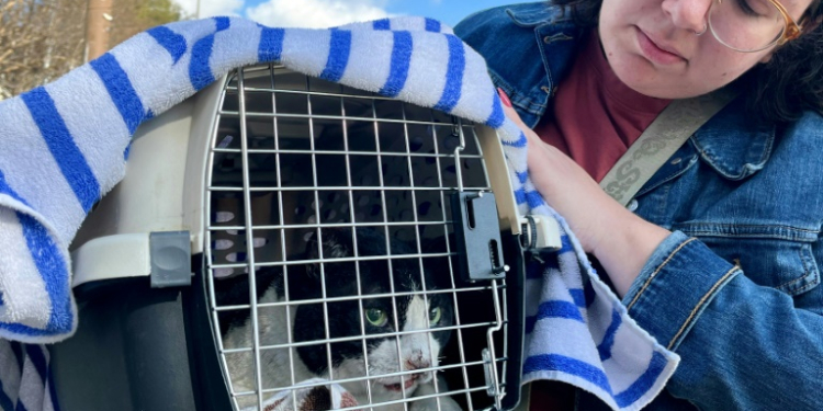 Pasadena (United States) (AFP) – When Serena Null saw the flames roaring toward her family home in the Los Angeles suburb of Altadena, she ran to find her pet Domino, but the cat eluded her grasp. “We could see the fire from the front door, and so we just didn’t have enough time, and we had to leave him,” the 27-year-old Null said. The ferocious blaze reduced her mother-in-law’s house to ashes, and a search of the blackened rubble the following day proved fruitless. Null feared she would never see her green-eyed friend again. But on Friday, to her amazement, she and Domino were reunited. “I just was so relieved and just so happy that he was here,” a tearful Null told AFP outside the NGO Pasadena Humane, where Domino — suffering singed paws, a burnt nose and a high level of stress — had been taken after being rescued.