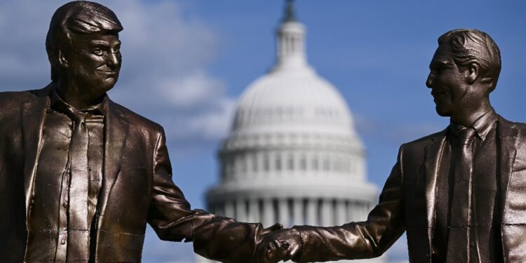 (AFP) – A statue depicting Donald Trump holding hands with Jeffrey Epstein, the late financier and sex offender, has reappeared in Washington after authorities had removed it last week. The bronze-painted work, originally titled “Best Friends Forever” but re-named “Why Can’t We Be Friends?”, was reinstalled Thursday on the National Mall, a short walk from the domed building that houses Congress.