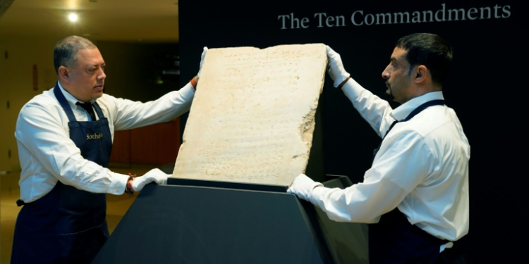 New York (AFP) – A stone tablet carrying engravings of the Ten Commandments sold for $5 million at auction on Wednesday, Sotheby’s announced. The high figure was notched despite questions around the tablet’s authenticity: no one has claimed it is the original, of Biblical fame, but some experts expressed doubts around its purported provenance, dating between the years 300 and 800 CE.