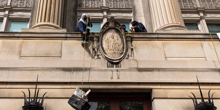 Pro-Palestinian student protestors pull a crate with pizza boxes inside from a balcony in Hamilton Hall at Columbia University in New York City on April 30, 2024 / ©AFP