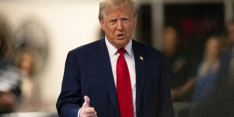 Former US President Donald Trump speaks to the media as he arrives for his trial for allegedly covering up hush money payments linked to extramarital affairs / ©AFP