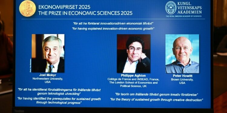 Stockholm (AFP) – The Nobel prize in economics was awarded on Monday to American-Israeli Joel Mokyr, France’s Philippe Aghion, and Canada’s Peter Howitt for their work on technology’s impact on sustained economic growth. Mokyr, 79, won one half of the prize “for having identified the prerequisites for sustained growth through technological progress,” the Royal Swedish Academy of Sciences said. Aghion, 69, and Howitt, 79, shared the other half “for the theory of sustained growth through creative destruction,” it added.