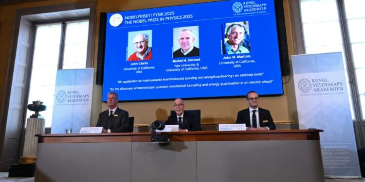 Stockholm (AFP) – Briton John Clarke, Frenchman Michel Devoret, and American John Martinis won the Nobel Prize in Physics on Tuesday for putting quantum mechanics into action and enabling the development of all kinds of digital technology, from cellphones to a new generation of computers. The Nobel jury noted that their work had “provided opportunities for developing the next generation of quantum technology, including quantum cryptography, quantum computers, and quantum sensors.”