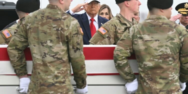 Dover (United States) (AFP) – US President Donald Trump attended the return Saturday of the bodies of the first six US soldiers killed during the escalating war with Iran. Trump, wearing a white “USA” baseball cap, saluted as troops carried each flag-draped case from a military transport plane at Dover Air Force Base in Delaware, where the remains of US troops killed overseas are returned to American soil.