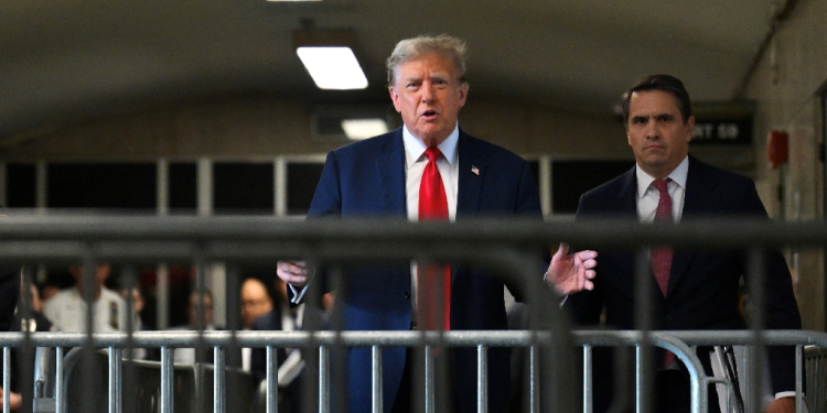 The Republican struck a defiant stance, telling a throng of journalists outside the gritty Manhattan courthouse that his trial was an “outrage” and an “assault on America.”