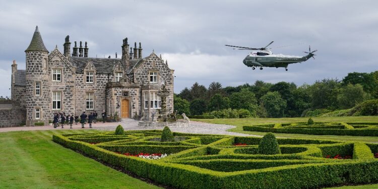 Marine One carrying US President Donald Trump and UK Prime Minister Keir Starmer arrives at MacLeod House on the Trump International Estate in Balmedie, Aberdeenshire / ©AFP