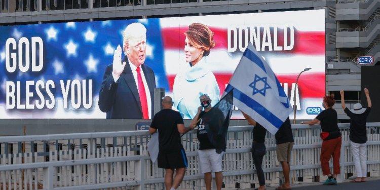 Then-US president Donald Trump and his wife Melania Trump are seen on a jumbo screen in Tel Aviv, Israel -- but lately, his level of support for Israel has been vague / ©AFP