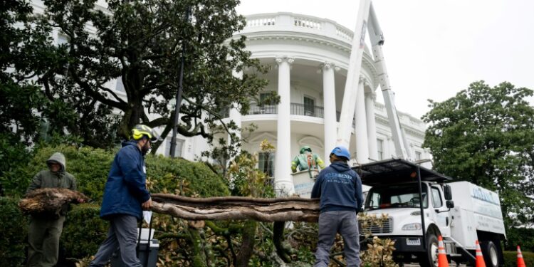 Workers remove a magnolia tree believed to have been planted by former US President Andrew Jackson nearly 200 years ago due to safety concerns, on the South Lawn of the White House in Washington, DC, on April 7, 2025. An enormous tree known as the Jackson Magnolia which has shaded the White House's South Portico for the majority of US presidencies will be taken down this week, Donald Trump said Sunday.. ©AFP