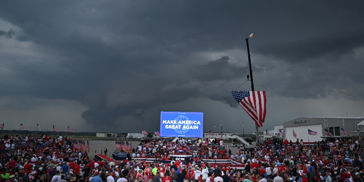 Supporters of Republican presidential candidate Donald Trump await his speech under the threat of a storm at a campaign rally in Wilmington, North Carolina, on April 20, 2024. The event was eventually called off because of weather / ©AFP