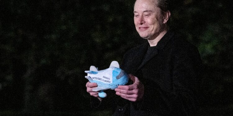 Tesla and SpaceX CEO Elon Musk holds a stuffed Air Force One toy after stepping off Marine One at the White House / ©AFP