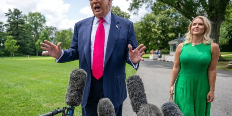 US President Donald Trump, alongside White House Press Secretary Karoline Leavitt, speaks to reporters on his way to board Marine One on the South Lawn of the White House on July 15, 2025, in Washington. ©AFP