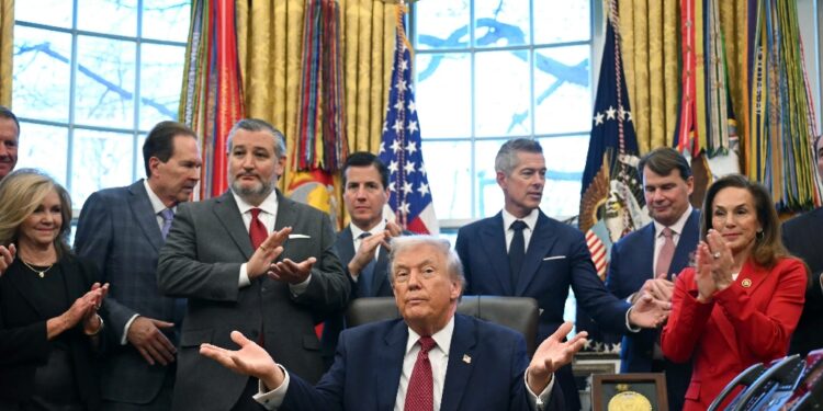 Trump was flanked in the Oval Office by the CEOs of Ford and Stellantis and a senior General Motors official, a show of buy-in from Detroit's Big Three. / ©AFP