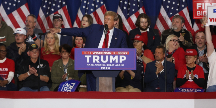 Former US President and 2024 presidential hopeful Donald Trump speaks during a campaign rally at the Hyatt Regency in Green Bay, Wisconsin, on April 2, 2024 / ©AFP