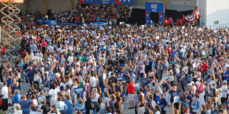 Live footage and photos from numerous media outlets, including AFP, showed the crowd of supporters, who packed an airfield hangar and spilled onto the tarmac to see Harris and her freshly announced running mate Tim Walz. The photo appeared to have been first posted by a Harris campaign official who received it from another staffer.