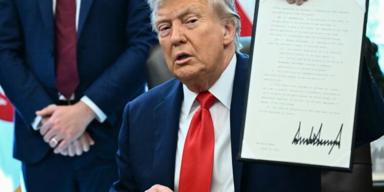 US President Donald Trump holds up an executive order in the Oval Office. ©AFP