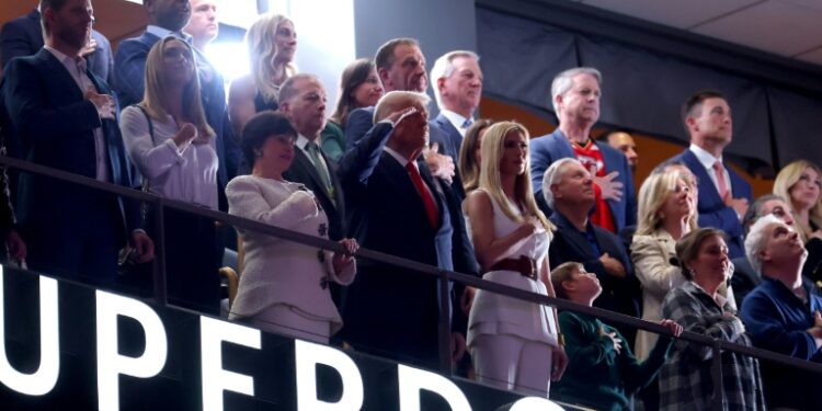 Donald Trump salutes during the US national anthem before the Super Bowl. ©AFP