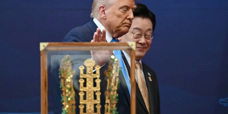 US President Donald Trump walks with South Korean President Lee Jae Myung during a ceremony where Trump is presented with a replica of a crown worn by the kings of Silla / ©AFP