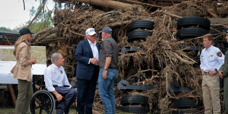 Kerrville (United States) (AFP) – US President Donald Trump spoke Friday of seeing devastation like he’d never before experienced as he toured parts of Texas hit by devastating flash floods that have left at least 120 people dead, including dozens of children. The Republican leader and First Lady Melania Trump were in the Hill Country of central Texas to meet first responders, victims’ families, and local officials, a week after a rain-swollen river swept away houses, camp cabins, cars, and people.