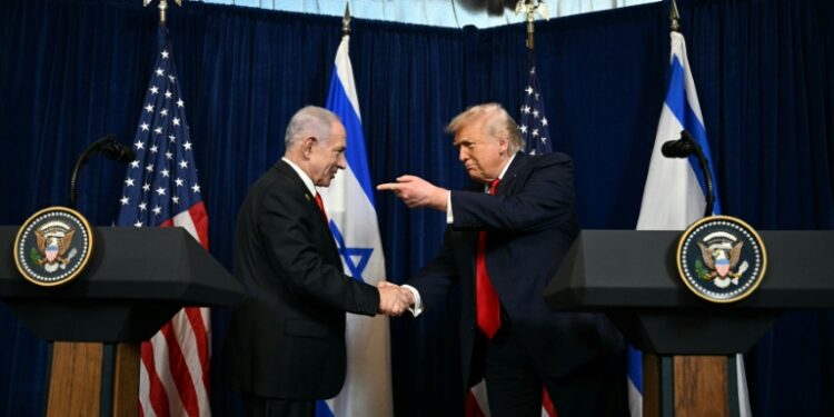 US President Donald Trump and Israeli Prime Minister Benjamin Netanyahu shook hands at the start of their joint press conference. ©AFP