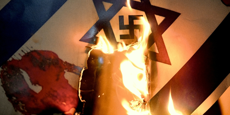 An Israeli flag with a swastika superimposed on the Star of David is burned at a pro-Palestinian protest in Istanbul / ©AFP