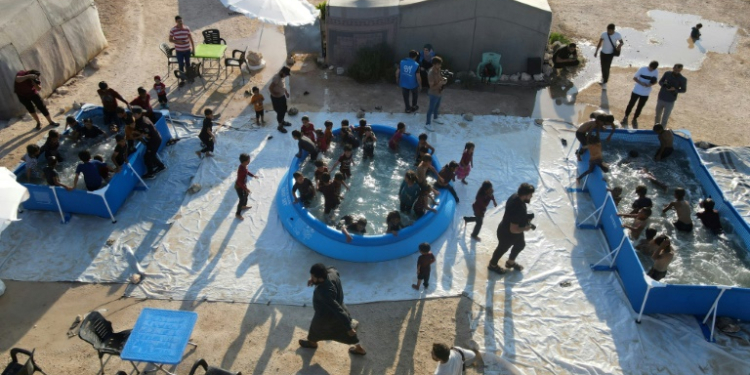 Displaced Syrian children play in swimming pools set up by the Smile Younited charity in the rebel-held part of Aleppo province on July 27, 2024. ©AFP