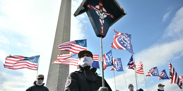 Members of Patriot Front rally near the Washington Monument on the National Mall in Washington, DC, during the annual March for Life. / ©AFP