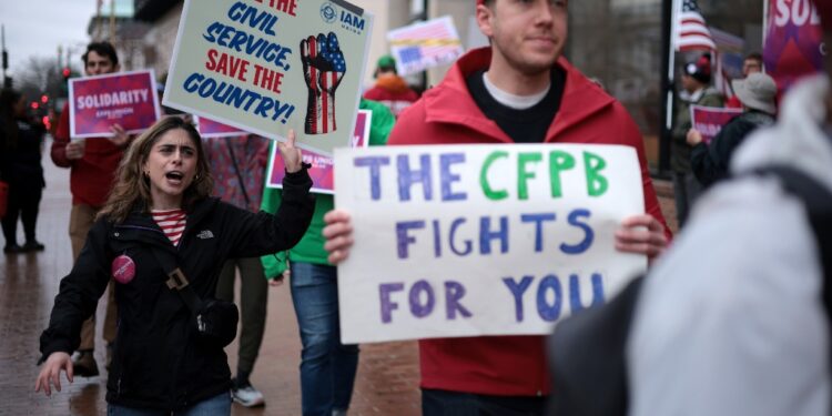 An appeals court cleared the way for the Trump administration's mass firings at the Consumer Financial Protection Bureau, which was the site of a March 2025 rally for federal workers / ©AFP
